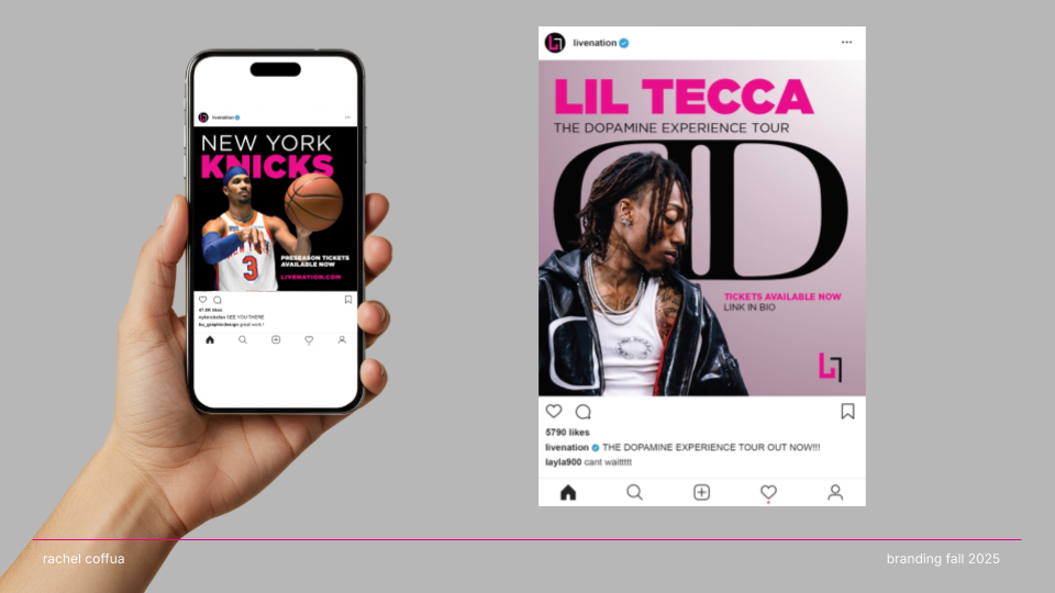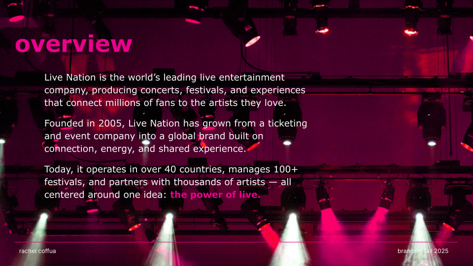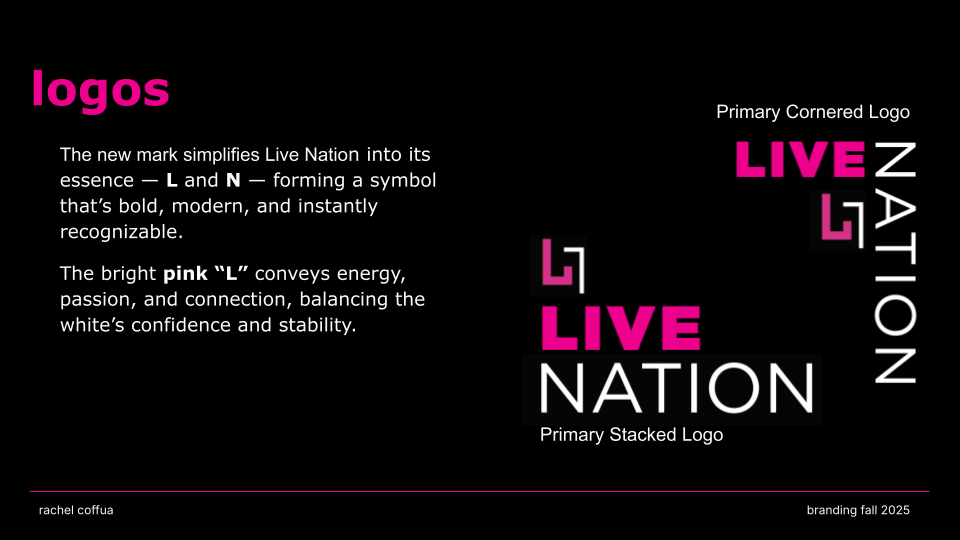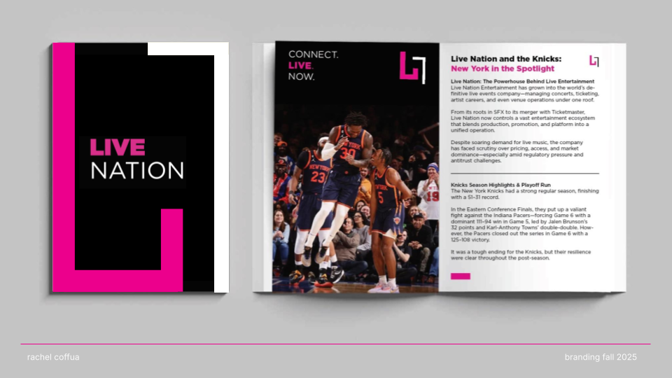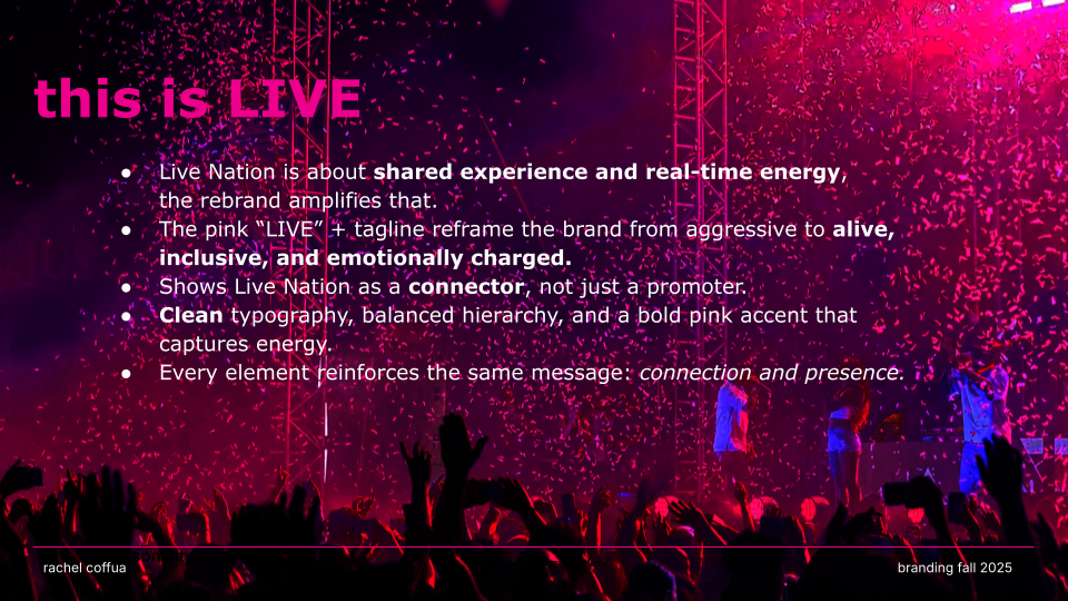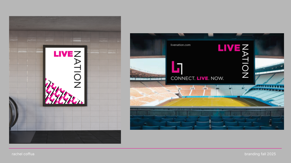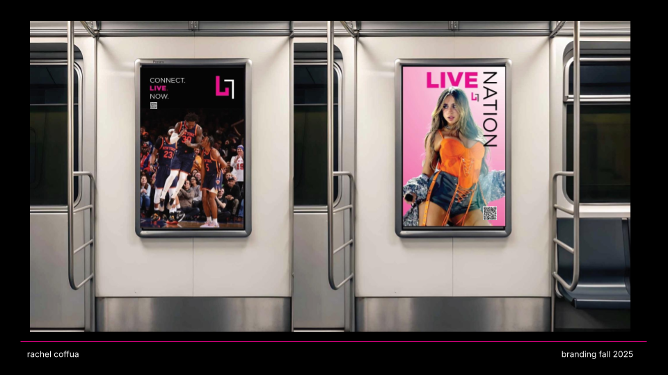 CONNECT. LIVE. NOW. is a rebrand of Live Nation that channels the emotion, energy, and cultural impact of live performance. Shifting away from a corporate aesthetic, the new identity embraces “The Connection of Live” through a modernized wordmark, an energized pink color palette, and a dynamic graphic system that echoes the rhythm and spontaneity of concerts. The result is a bold, flexible visual language that positions Live Nation not just as an entertainment company, but as a cultural connector amplifying the shared emotion, diversity, and immediacy that define live experiences.