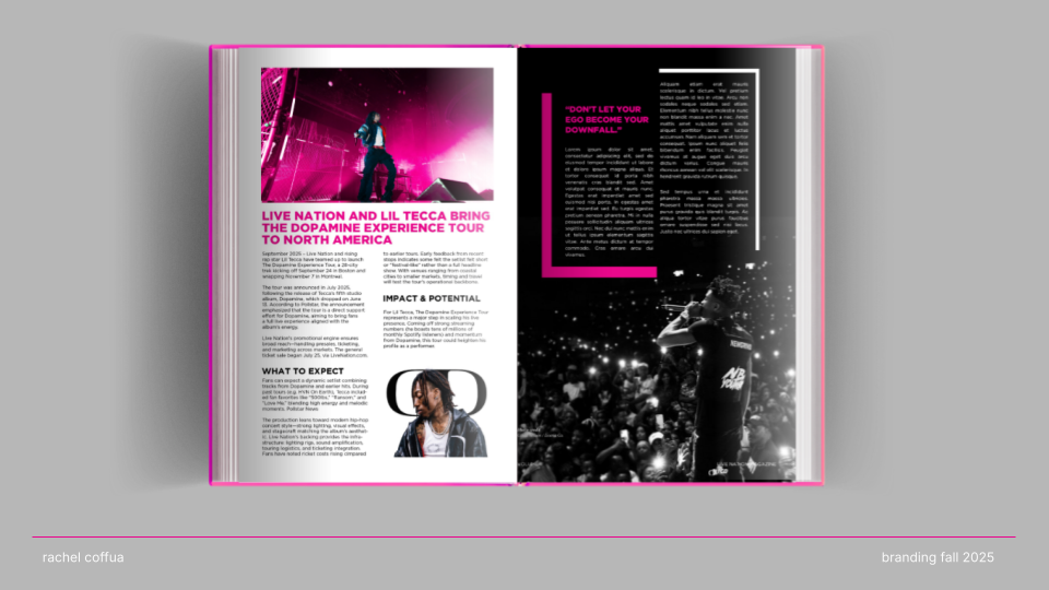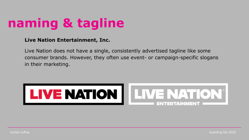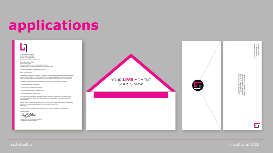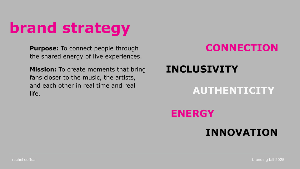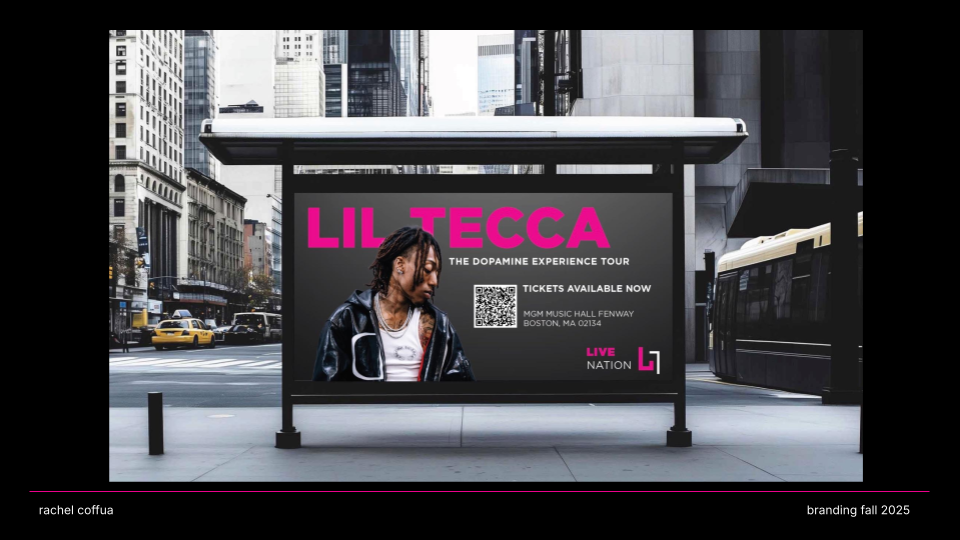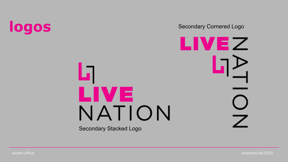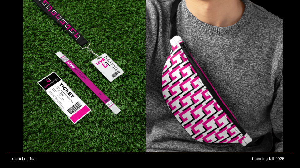 CONNECT. LIVE. NOW. is a rebrand of Live Nation that channels the emotion, energy, and cultural impact of live performance. Shifting away from a corporate aesthetic, the new identity embraces “The Connection of Live” through a modernized wordmark, an energized pink color palette, and a dynamic graphic system that echoes the rhythm and spontaneity of concerts. The result is a bold, flexible visual language that positions Live Nation not just as an entertainment company, but as a cultural connector amplifying the shared emotion, diversity, and immediacy that define live experiences.