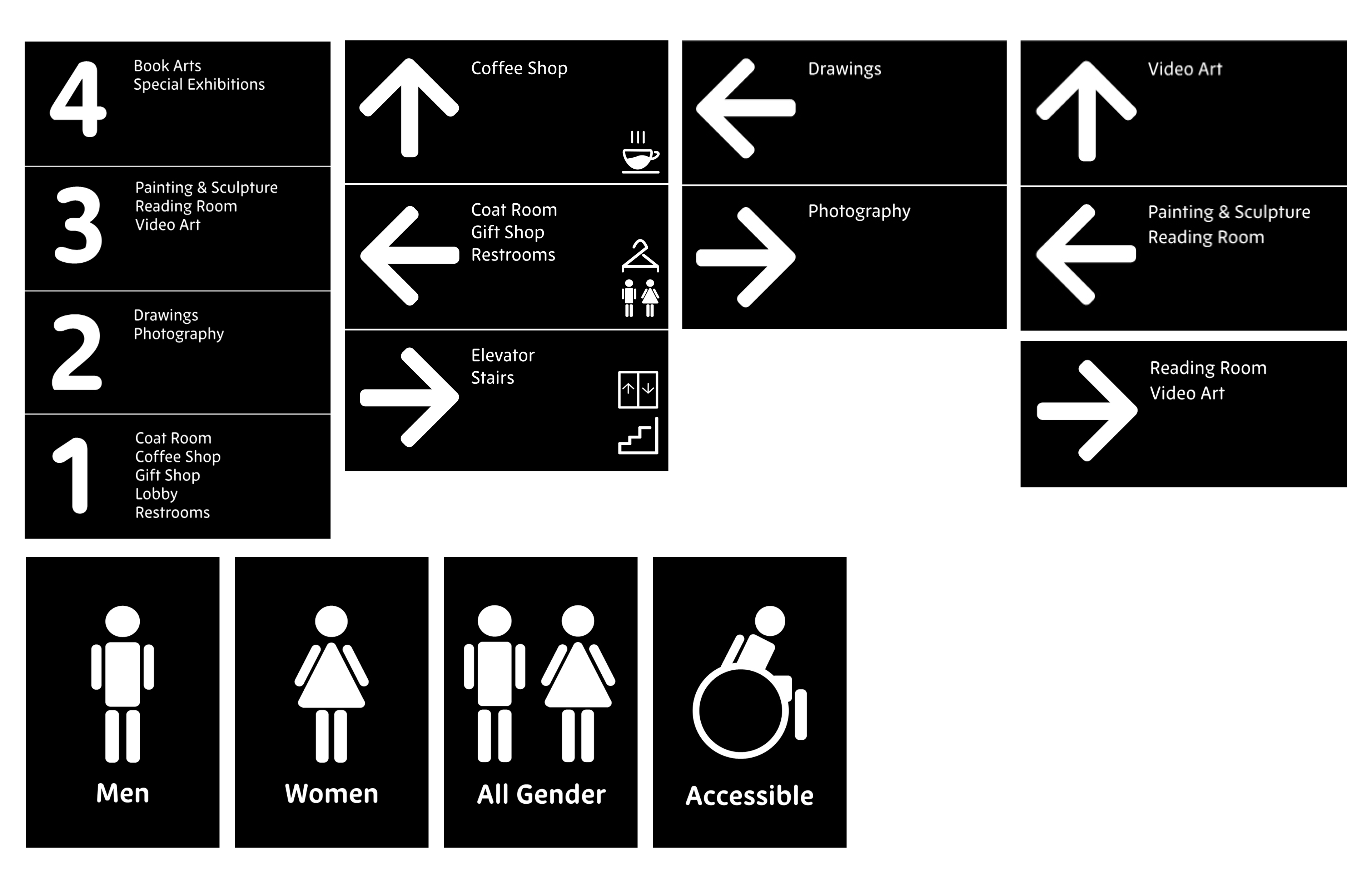 Museum signage and pictograms designed in Adobe Illustrator.
