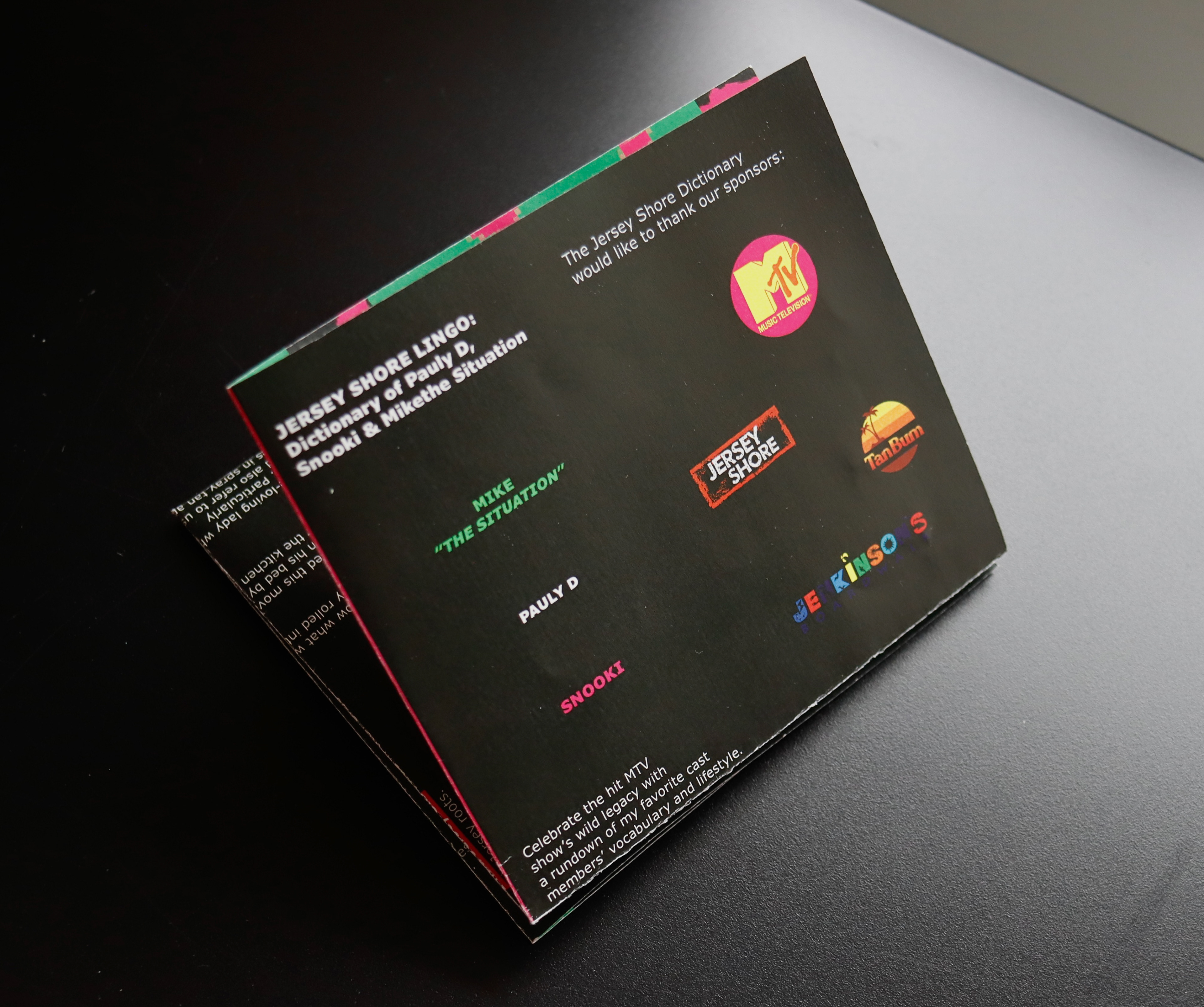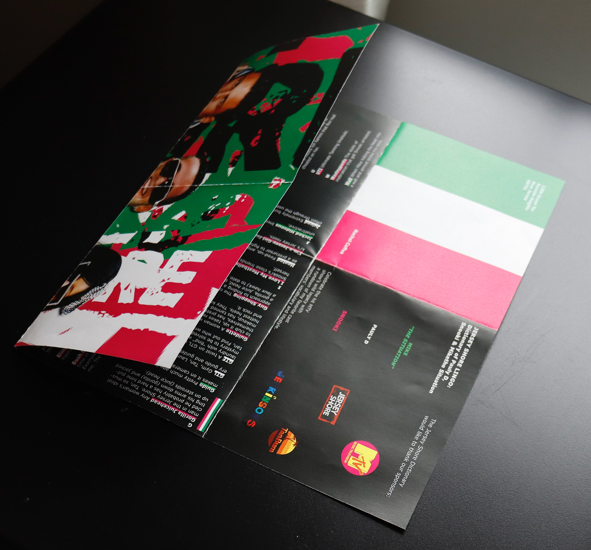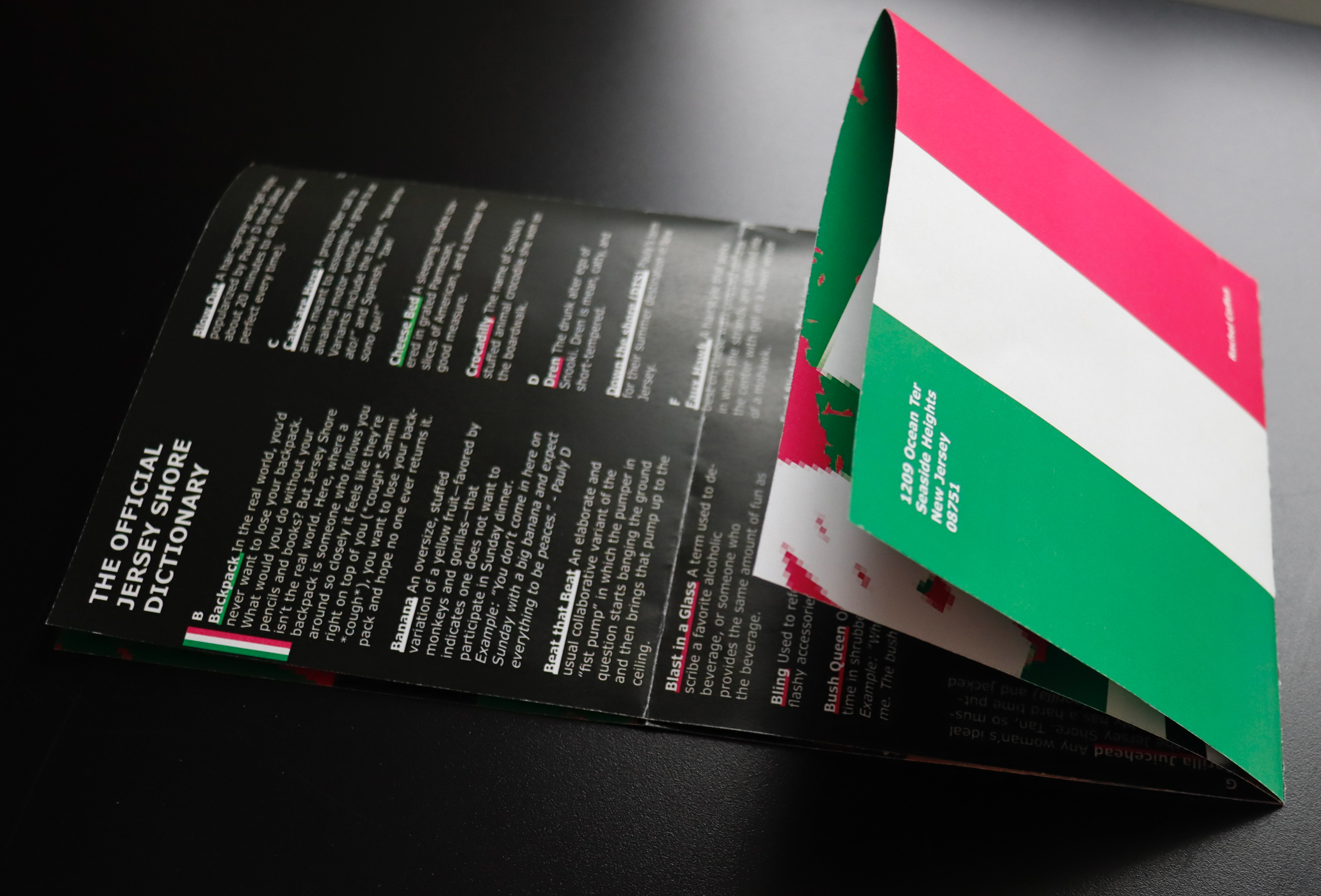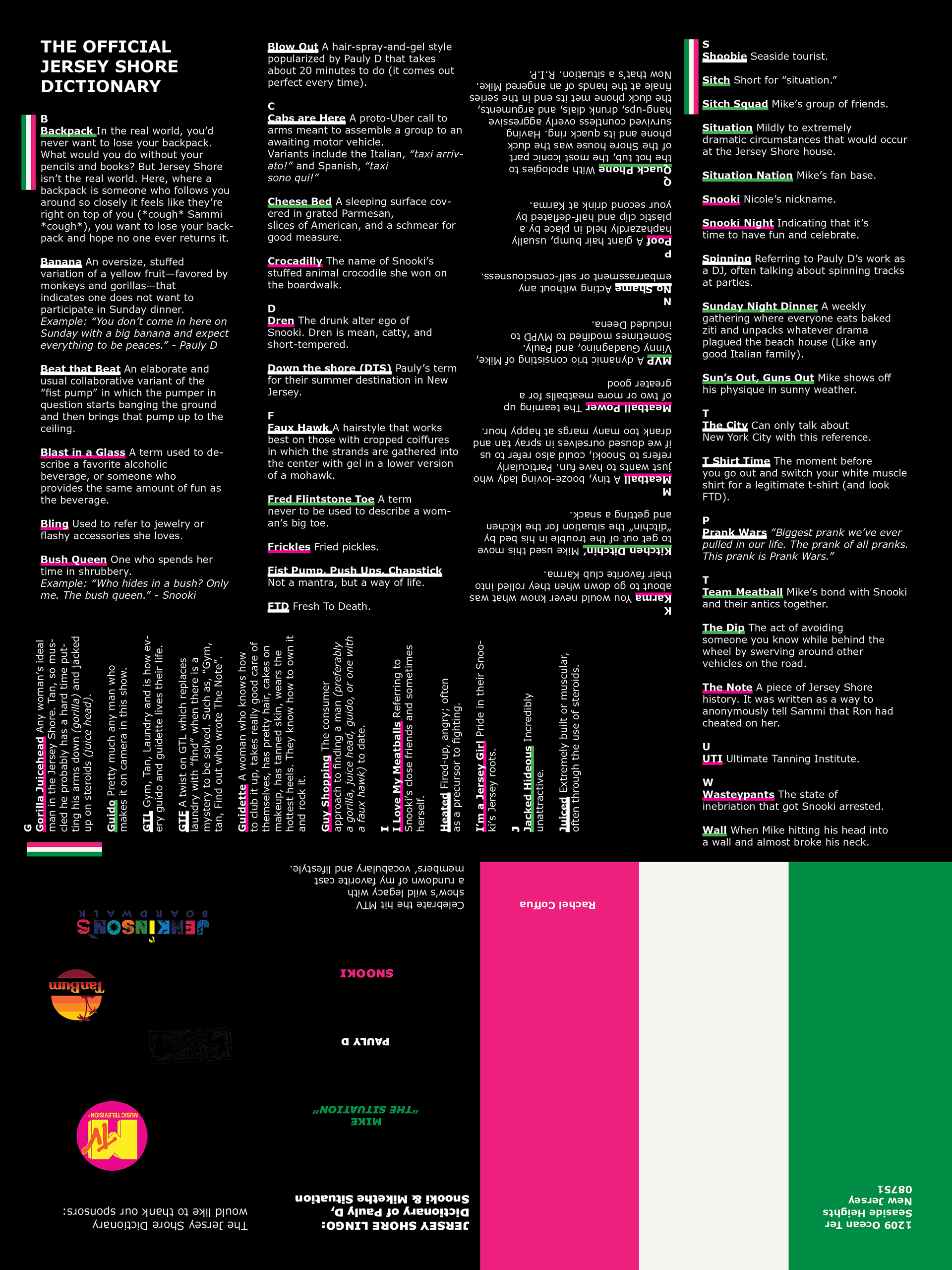A dynamic foldout that compiles three mini glossaries celebrating the iconic language of Jersey Shore, spotlighting Snooki, Pauly D, and Mike “The Situation.” Each section features 20 curated terms and definitions that capture their most memorable sayings, mannerisms, and cultural moments. Designed with humor and precision, the piece functions as the Official Jersey Shore Dictionary; a playful study in how pop culture shapes language, personality, and visual storytelling.